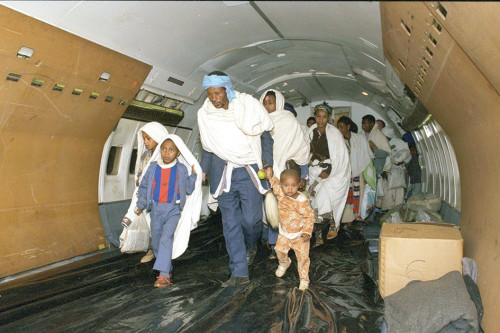 ההגירה של קבוצה זו לישראל היא מבצע שלמה. עולים שהגיעו מאתיופיה לישראל במבצע שלמה יורדים ממטוס הרקולס בבסיס של חיל האוויר, 25.5.1991.